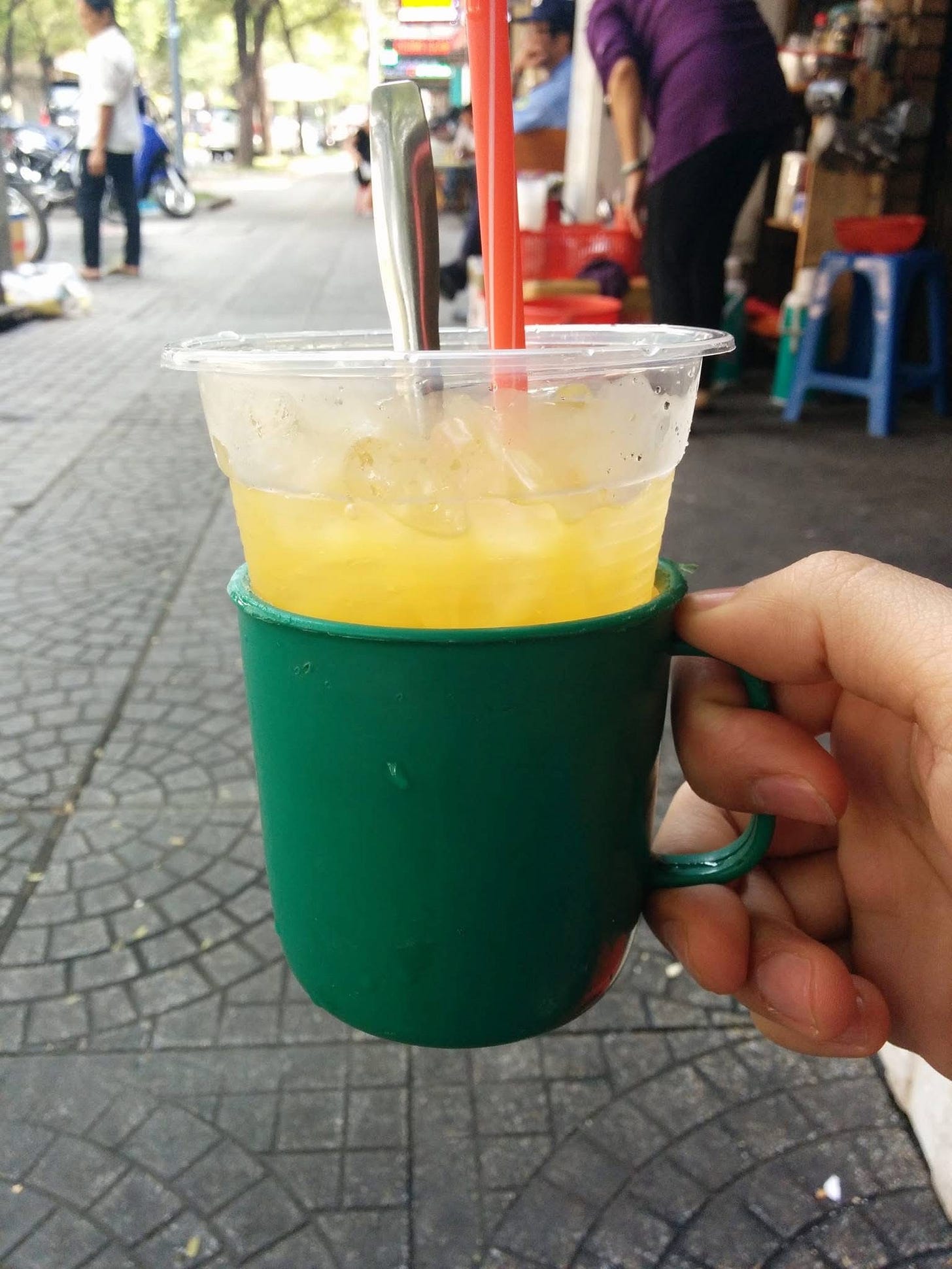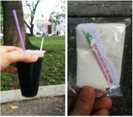 Nước và đá đựng trong ly nhựa mềm, siêu mềm (ngoài Hà nội hay dùng để đựng nước mía hoặc cốc uống 1 lần), cụ bán hàng cho thêm 1 cái ly cứng để đựng. Vì sao lại thế? Mình thử cầm ly nhựa mềm, cầm một lúc sẽ bị lạnh tay vì rất nhiều đá bên trong ly, loại đá nhỏ tan nhanh. Ly mềm, mềm lắm mà nhỡ/chẳng may bóp tay nhẹ là đá và nước trào ra ngoài. Vậy là cụ cho thêm 1 ly xanh bên ngoài để cầm cho tiện mà không sợ lạnh. Bonus thêm hình dưới, uống cà phê take-away kèm theo khăn giấy và tăm.