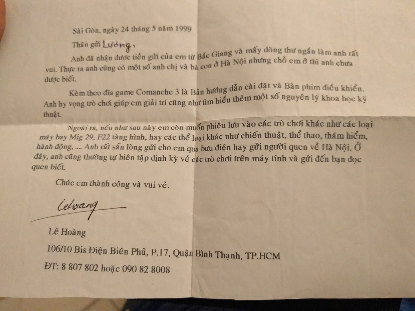 Có người thích Sài gòn ở thời tiết, có người thích Sài gòn ở ẩm thực, ai đó lại thích Sài gòn ở tính cách con người. Và mọi người, toàn bộ những người đã đến Sài gòn và ở đây đều thích cách thức người Sài gòn cung cấp dịch vụ. Mình đang làm ngành dịch vụ và thán phục cách thức mà con người ở đây cung cấp dịch vụ. Bức thư trong hình dưới đây đã gần 17 tuổi. Hồi đó, nhà mình mới sắm máy tính để bàn và mình chả biết làm gì ngoài game.